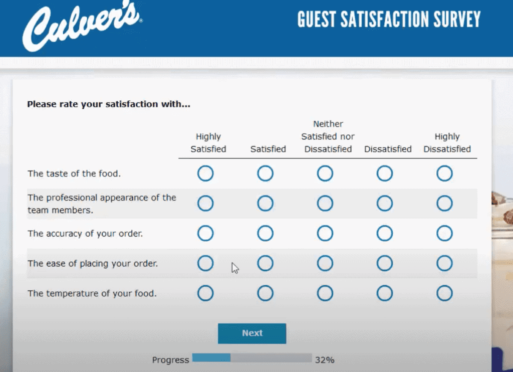 - Next you will be asked about the quality of the food and service you received